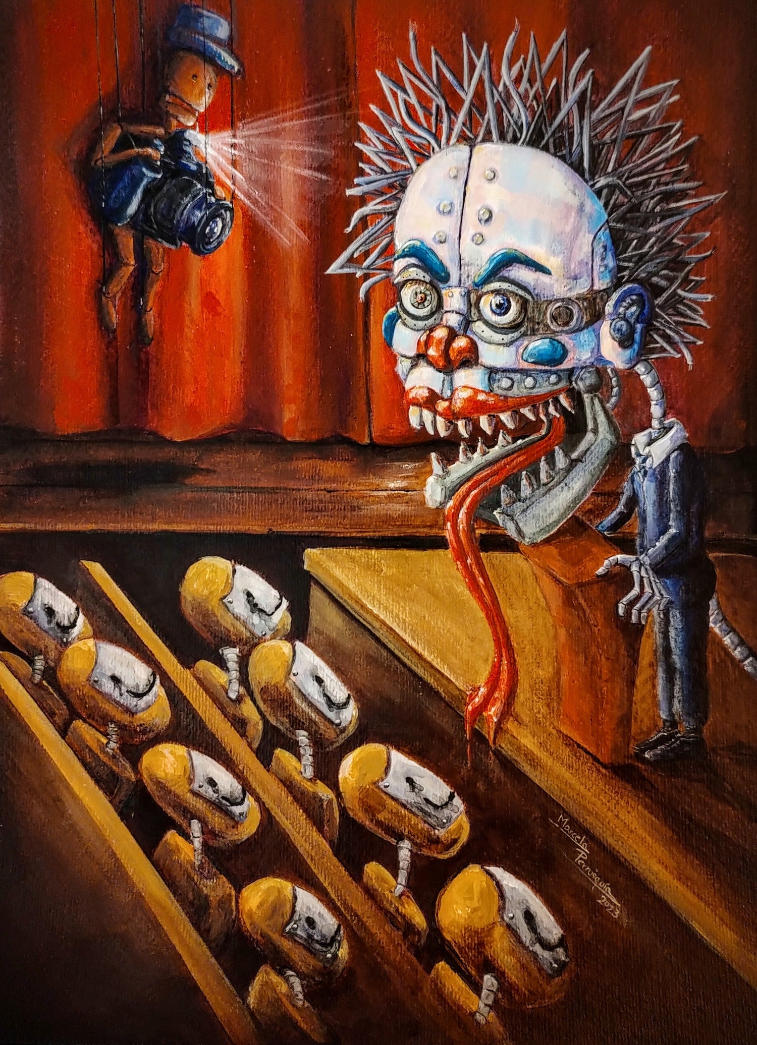 This artwork is an allegory representing the government and the indoctrination of the population, creating propaganda by pulling the strings of media and politicians to display a show called governance. This work was created from a nightmare.
