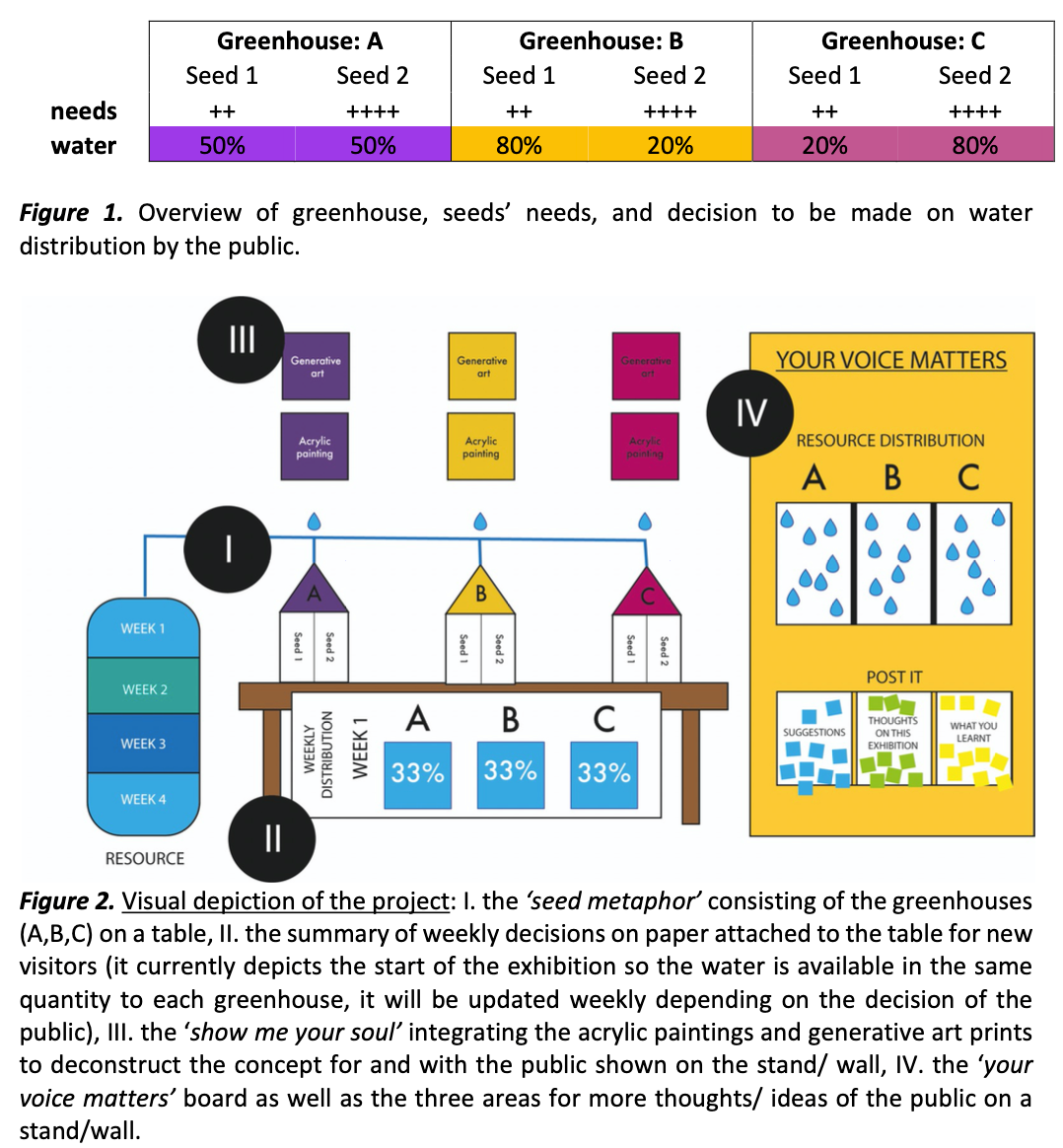 Using a multi-methods approach and mixed media art techniques, we prototype alternative governance systems. We depart from an analogy in which different type of seeds with distinct needs represent people’s needs and voices. Greenhouses represent societies where governances take place, and water the available resource to tackle the needs of the seeds. We invited the viewers to decide on which greenhouse they wanted to provide the available water to.