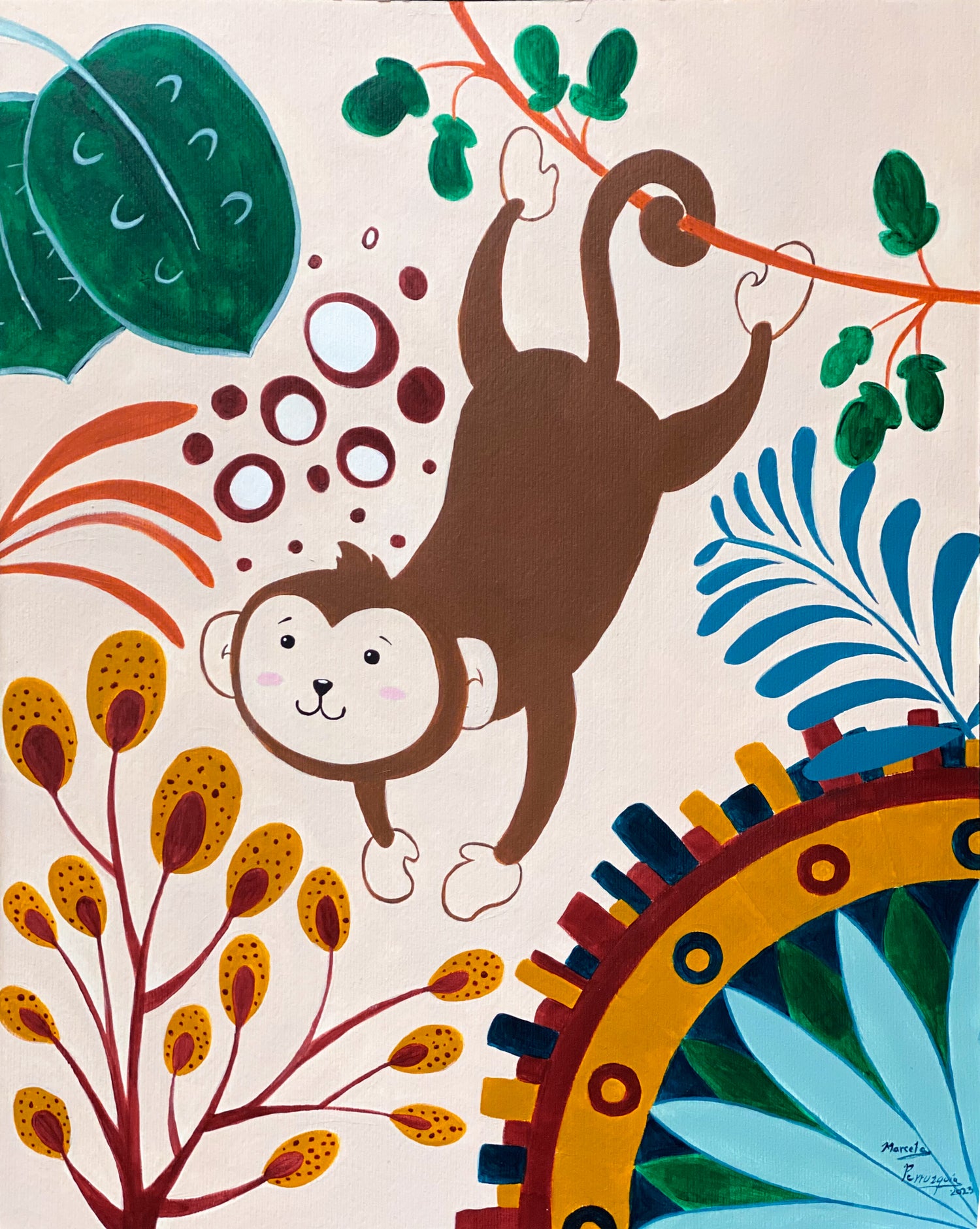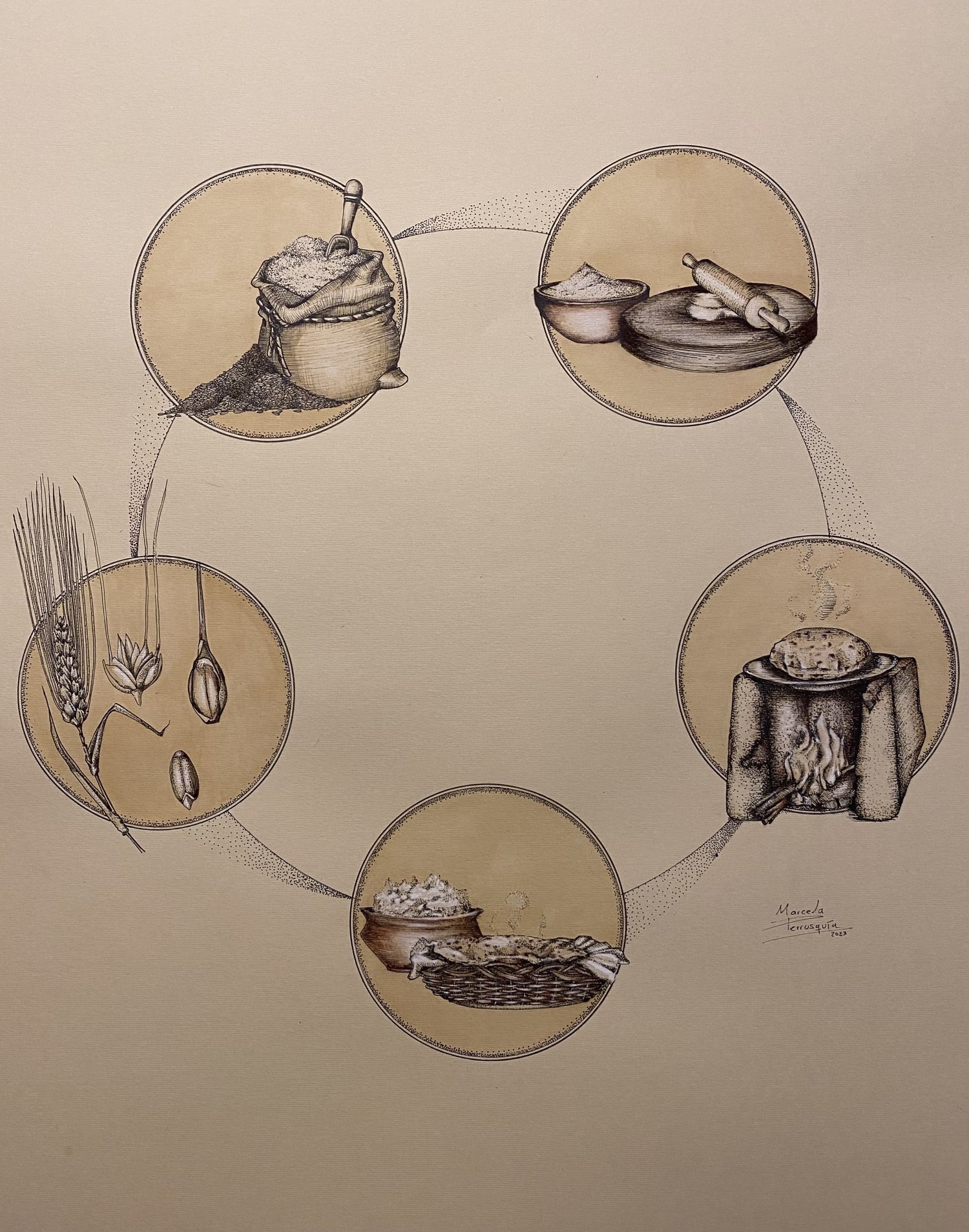 This artwork celebrates the traditional process of cooking Indian roti, highlighting its timeless cycle and cultural significance.