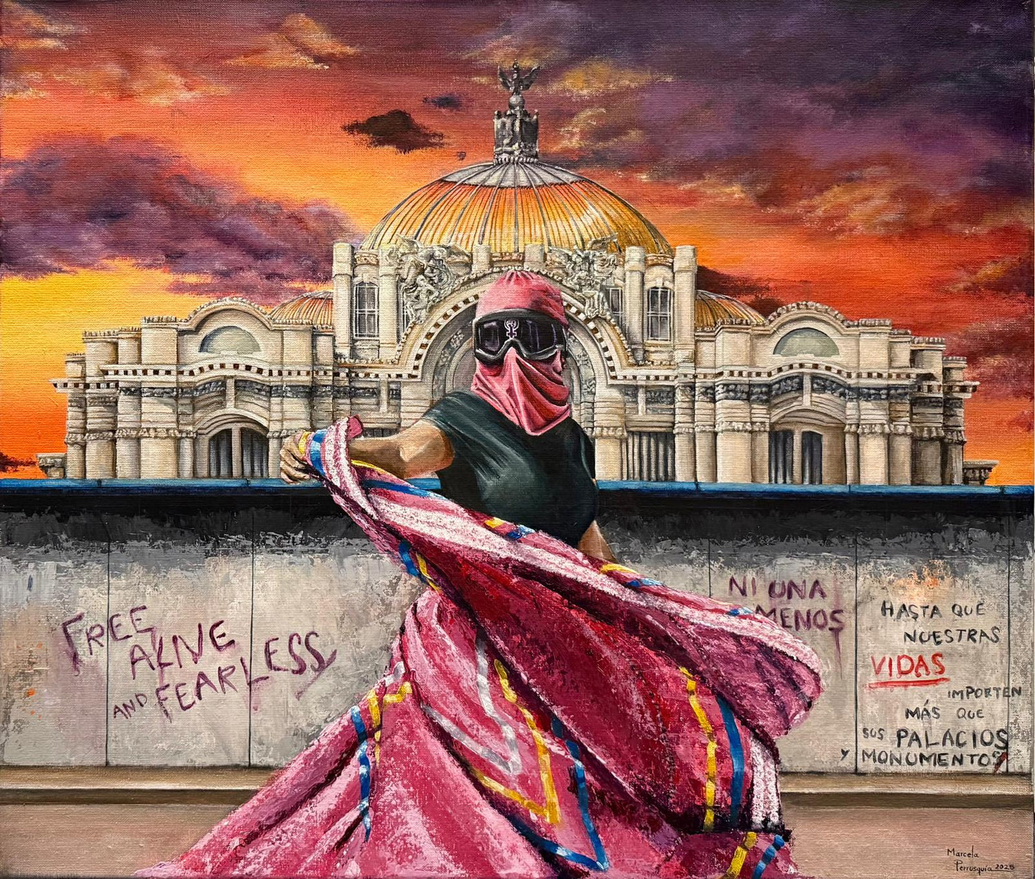 A photograph from Mahé Elipe’s series Sembrando Luchas served as a inspiration for this project, leading to the creation of Danza de Protesta - a painting that captures the strength and urgency of women’s protests in Mexico. In a country where an average of 10 women are murdered each day and over 70% experience violence in their lifetime, these women rise to confront a system marked by deep-rooted inequality.